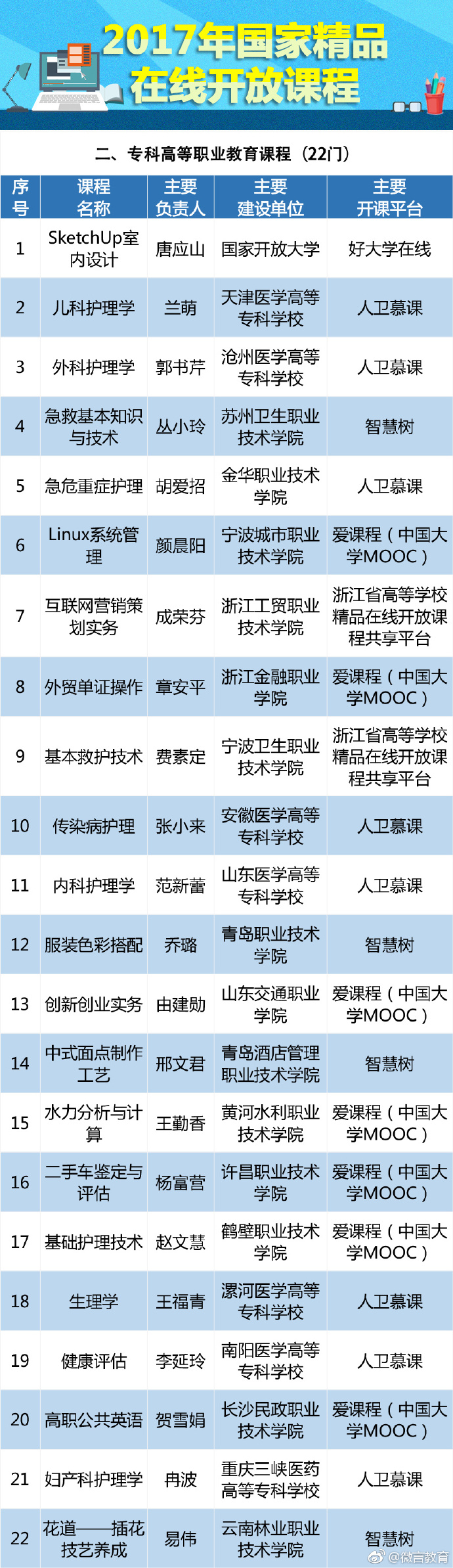 近日,经专家评议及综合评定,教育部认定490门课程为2017年国家精品在线开放课程,现进行公示。公示期为2017年12月15日至12月21日。有哪些精品在线开放课程?快跟小编一起来看看↓↓↓ 你还希望增加哪些课程?留言给我们!