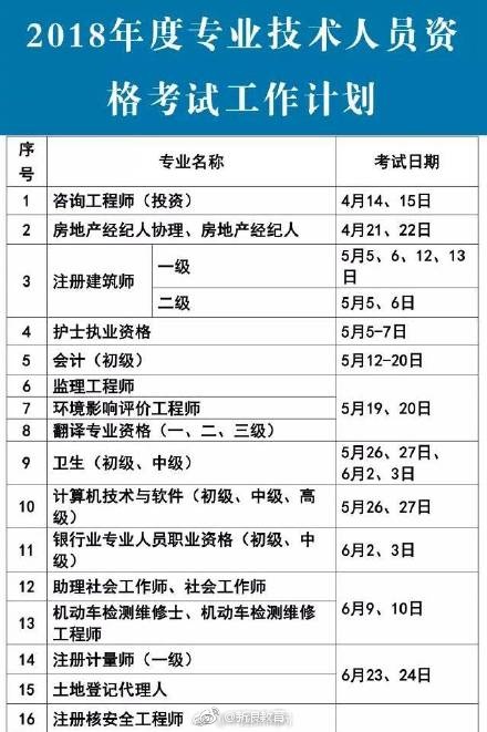 人社部印发通知,公布2018年度专业技术人员资格考试工作计划。赶紧转发和收藏吧!具体时间请以官方公布为准! 你准备考什么证呢?